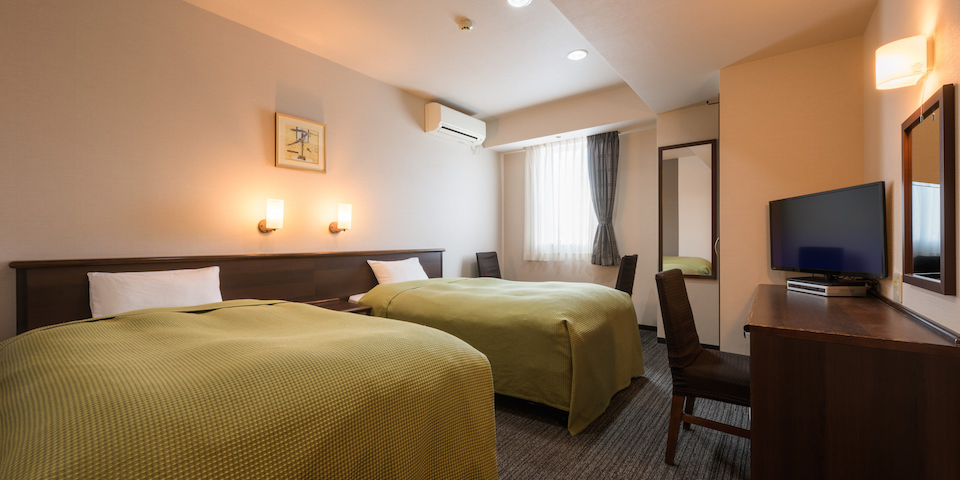 2008年4月リニューアルオープンの新館・ツインベッドのお部屋です。Wi-Fi(無線LAN)完備。有線LANによるインターネット接続も可能です。全室液晶TV、バス・ウォシュレットトイレ付き。